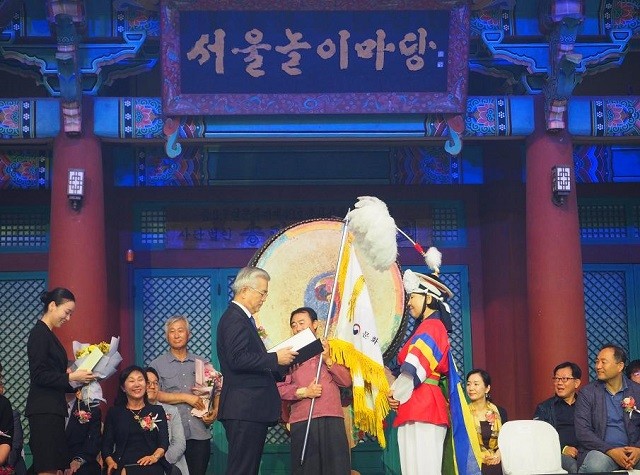 | 광주광역시 대표인 광주지산농악이 ‘제60회 한국민속예술축제 및 제26회 전국청소년민속예술제’에서 국무총리상 수상하고 있다.=사진. 광주광여시 제공 |