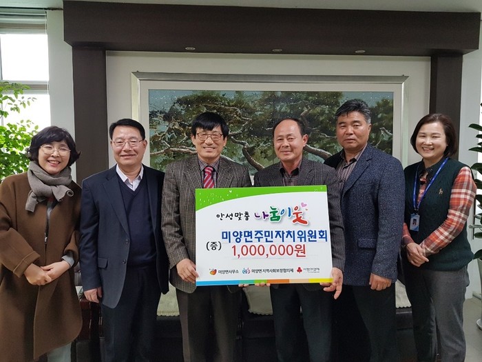 30일 경기 안성시 미양면주민자치위원회가 '지역내 어려운 이웃을 위해 써달라'며 회원들이 십시일반 정성을 모아 마련한 성금 100만원을 면 지역사회보장협의체에 기탁했다. 사진은 성금 전달 후 위원회 및 협의체 관계자들이 기념촬영을 하는 모습. (사진제공=안성시청)
