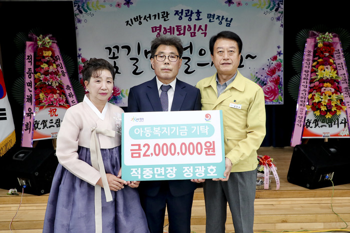 합천군 정광호 적중면장은 지난 5일 명예퇴임식에서 아동복지기금 조성에 보태달라며 따뜻한 마음과 기금 200만원을 전달했다.