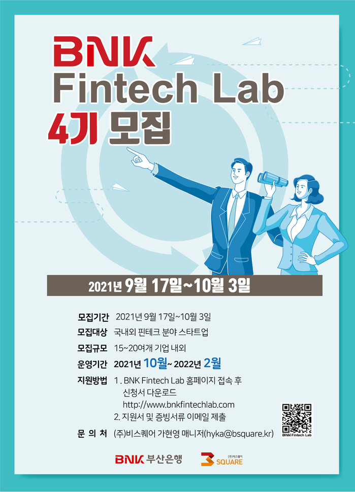 [시민일보 = 여영준 기자] BNK부산은행이 핀테크 분야 스타트업을 육성·발굴하기 위해 ‘BNK핀테크랩 4기’를 모집한다고 24일 밝혔다.