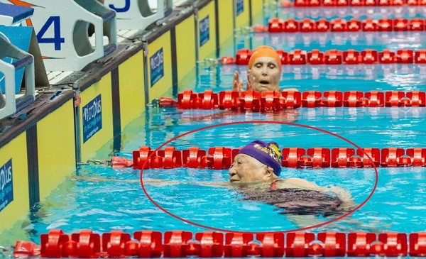 | ▲ 광주세계마스터즈수영선수권대회에 참가한 93세의 최고령 아마노 토시코 할머니의 역영 모습 |
