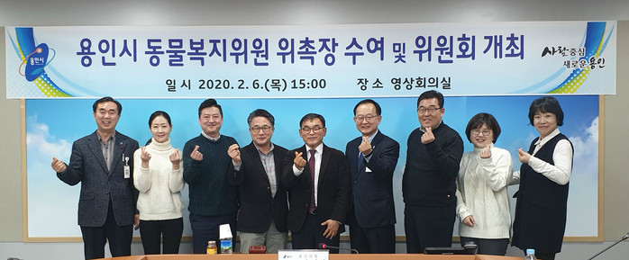 경기 용인시는 6일 시청 영상회의실에서 시의 동물 관련 정책을 자문할 '동물복지위원회 위원' 8명을 위촉했다. 사진은 위촉식에 참석한 관계자들이 기념촬영을 하는 모습.(사진제공=용인시청)