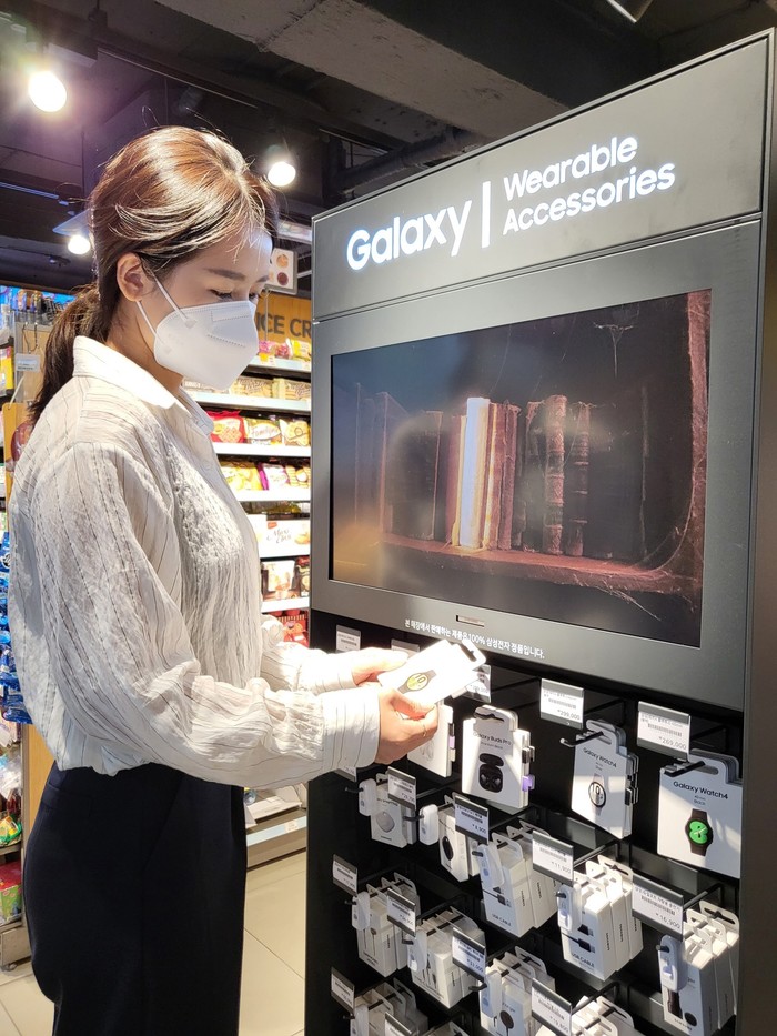 | ▲ '갤럭시 워치4' '갤럭시 버즈2' 등 최신 갤럭시 웨어러블 기기를 이마트24에서 판매한다. 이마트24 삼청동점에 설치된 진열대 모습.(사진제공=삼성전자) |