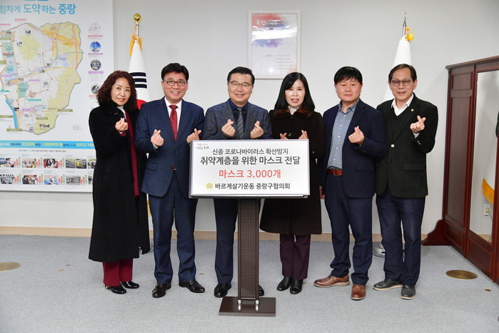 서울 중랑구는 신종 코로나바이러스 감염증 확산을 방지하고자 바르게살기운동 중랑구협의회로부터 감염 취약계층과 소외계층을 위해 마스크 3000장을 기부받았다. 이번 전달식은 6일 구청 4층 구청장실에서 류경기 구청장, 오성문 바르게살기운동 중랑구협의회장, 신중석 수석부회장, 박연선 여성회장이 참석한 가운데 진행됐다. 사진은 류 구청장(가운데)이 오성문 바르게살기운동 중랑구협의회장(왼쪽에서 두 번째)과 기념촬영을 하고 있는 모습.(사진제공=중랑구청)