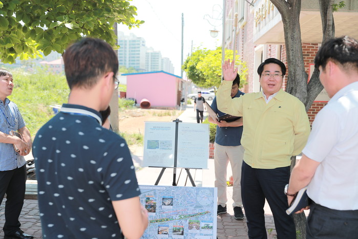 지난 6월25일 배방읍에 위치한 생활SOC 입지 후보지를 방문한 오세현 시장(오른쪽에서 두 번째)이 관계자들과 이야기를 나누고 있다. |