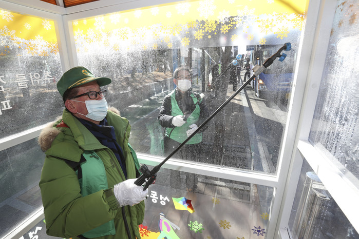 서울 성동구 새마을방역봉사대가 6일부터 신종 코로나바이러스 감염증 확산 방지를 위해 마을 주택가 및 공원, 버스정류장 등을 대상으로 방역활동을 펼치고 있다. 사진은 새마을방역봉사대가 버스정류장 바람막이 텐트에서 방역 작업을 하고 있는 모습.(사진제공=성동구청)