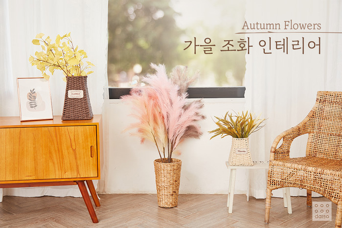 아성다이소에 따르면 핑크뮬리, 코스모스 등도 조화로 준비되어, 화병이나 자연소재 꽃 바구니와 함께 구성하면 센스 있는 가을 인테리어를 만들 수 있다.