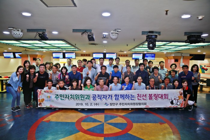 경기 수원시 장안구 주민자치위원장협의회는 최근 광교볼링장에서 각 동 주민자치위원장과 과·동장 등 50여명이 참여하는 친선 볼링대회를 개최했다. 사진은 대회에 참여하는 관계자들이 기념촬영을 하는 모습.(사진제공=장안구청)