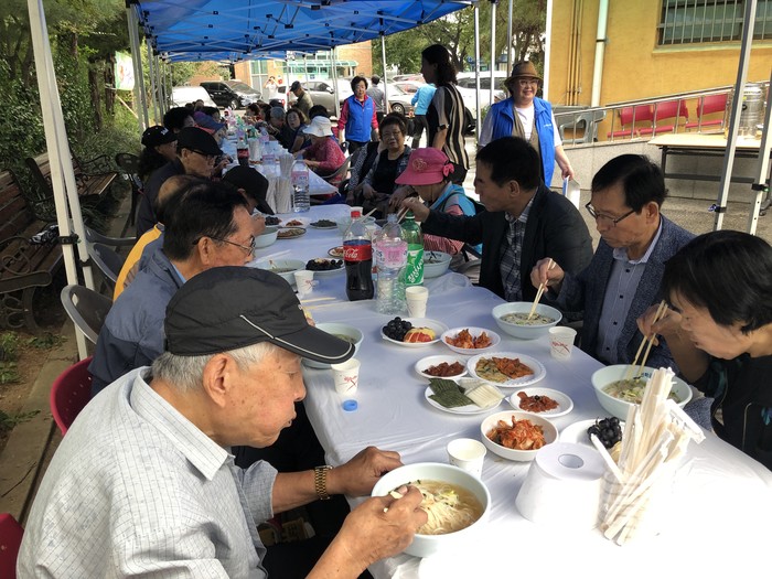 인천 연수구 선학동 주민자치위원회는 최근 행정복지센터 앞마당에서 지역내 노인들과 함께하는 ‘사랑의 국수 나눔 행사’를 진행했다. 사진은 행사에 참여한 노인들이 국수를 먹고 있는 모습.(사진제공=연수구청)