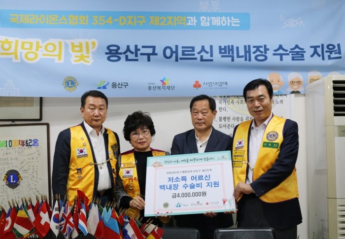 서울 용산구 용산복지재단이 최근 국제라이온스협회 354-D지구 제2지역으로부터 저소득 노인 백내장 수술비 400만원을 전달 받았다. 기부금은 지역내 노인 20명의 백내장 수술비로 사용될 예정이다. 사진은 기부금 전달 후 관계자들의 기념촬영 모습. (사진제공=용산구청)