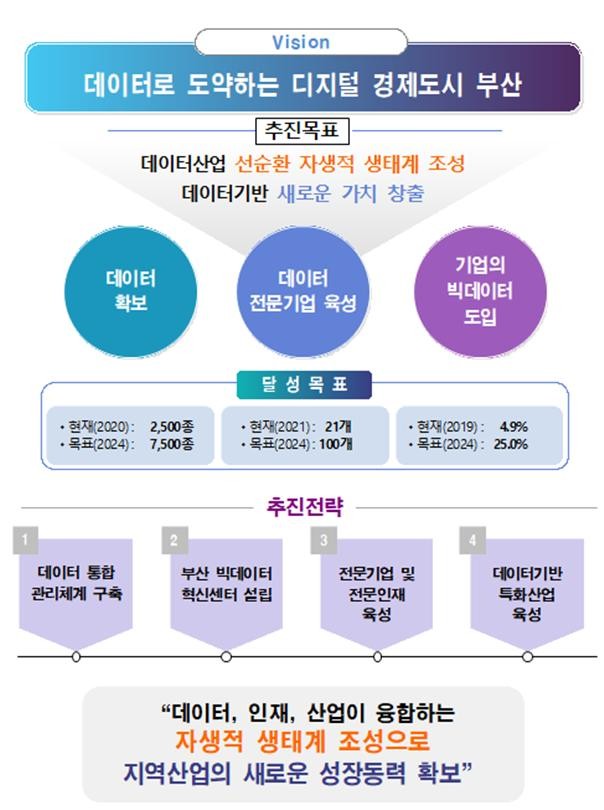 공공‧민간 데이터통합관리체계 구축, 부산 빅데이터혁신센터 설립, 데이터 전문기업 및 전문기업 육성, 데이터기반 특화산업 육성 등 4대 전략 14개 과제 추진