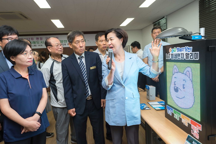 김수영 서울 양천구청장이 최근 신월3동 주민센터에서 열린 ‘제122차 현장구청장실’에서 IoT 미세먼지알리미 사업에 대해 설명했다. 이날 김 구청장은 스마트시티 추진 사업지도 시찰했다. 사진은 김 구청장(오른쪽)이 설명하고 있는 모습.(사진제공=양천구청)