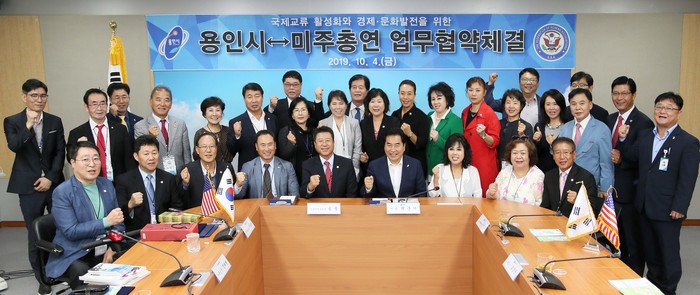경기 용인시는 4일 시청 정책토론실에서 미주한인회총연합회와 국제교류 활성화 및 경제·문화 발전을 위한 업무협약을 체결했다. 이날 협약에는 백군기 시장과 폴 송 수석부회장을 비롯한 36명의 미주한인회총연합회 회장단이 함께했다. 사진은 협약식에 참석한 백 시장 및 참여자들이 기념촬영을 하고 있는 모습.(사진제공=용인시청)