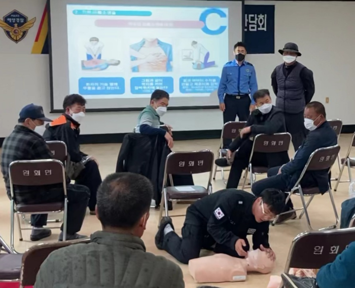 | ▲ 목포해경, 지역 민간해양구조대원들과 함께 심폐소생술을 공유 하고 있다.(출처=목포해경 진도 파출소) |