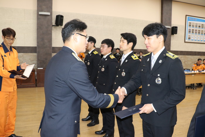 경기 부천소방서는 최근 본서 3층 어울마당에서 일분일초가 위급한 긴급상황에서 신속하고 적극적인 응급처치로 심정지 환자를 소생시킨 구급대원 등에 대해 하트세이버 인증서 및 기장을 수여했다. 사진은 인증서를 수여하고 있는 모습.(사진제공=부천소방서)