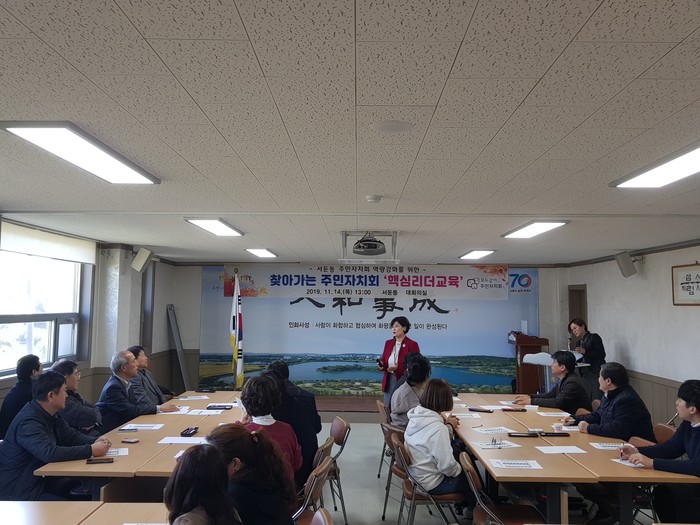 경기 수원시 권선구는 14일 서둔동 행정복지센터 대회의실에서 서둔동 주민자치회 위원 50여명을 대상으로 찾아가는 주민자치회 핵심리더 교육을 실시했다. 사진은 전문강사가 '타인에 대한 이해와 주민리더의 회의 방법'이라는 주제로 강의를 진행하는 모습.(사진제공=권선구청)