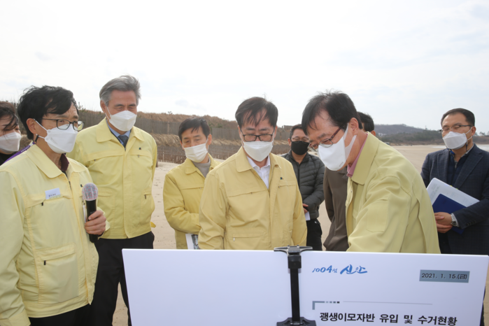 신안군은 괭생이모자반의 신속한 수거를 위해 해양쓰레기 정화사업비 11억 8천만원을 14개읍·면과 3개사업소에 배정하였으며 해안가 및 양식장에 부착된 모자반을 수거하는데 비치클리너와 중장비 등을 동원하여 수거에 최선의 노력을 다하고 있다.