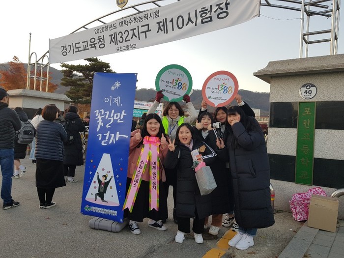 경기 포천시 청소년상담복지센터는 최근 2020학년도 대학수학능력시험을 마친 청소년을 격려하기 위해 ‘열정대박 수험생 청소년을 만나러 가즈아’ 행사를 개최하고 동남고, 포천고 등 수험장소를 방문했다. 사진은 기념촬영을 하는 모습.(사진제공=포천시청)