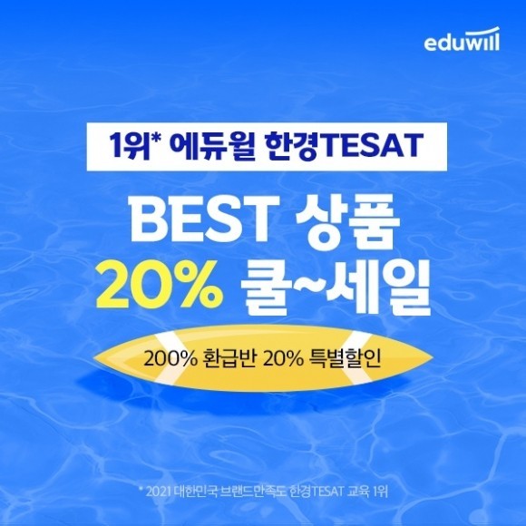 [시민일보 = 여영준 기자] 종합교육기업 에듀윌(대표 박명규)은 한경TESAT(테셋)을 준비하는 수강생들을 위해 베스트상품 20% 할인 이벤트를 개최한다고 밝혔다.