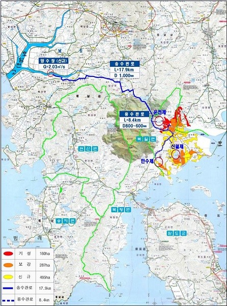 이에 군은 여유수량이 풍부한 고천암호의 물을 관로를 통해 북일면으로 공급하는 수계 연결 사업을 추진, 명현관 군수 등이 수차례 중앙부처를 찾아 지속 건의한 결과 지난해 353억 원의 사업비가 반영되면서 오랜 숙원을 해결하게 됐다.