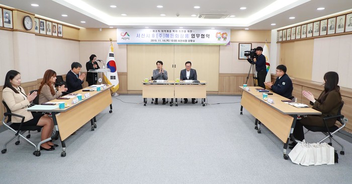 충남 서산시가 14일 시청 상황실에서 (주)해든화장품과 지역사회 복지 향상과 기업체 협력을 통한 커뮤니티 케어 기반 마련을 위한 업무협약식을 열고 지역내 저소득 취약계층 복지 증진을 위한 자원 연계를 약속했다. 사진은 협약식 진행 모습. (사진제공=서산시청)