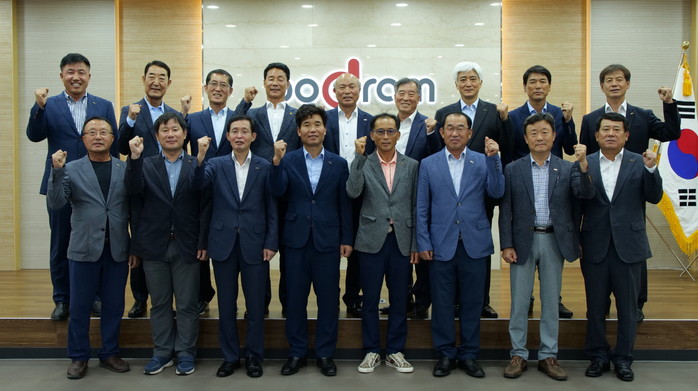 | ▲ 도드람 박광욱 조합장(윗줄 가운데)을 비롯한 임원진이 새로운 슬로건 '맛있는 한돈! 건강한 도드람'을 외치며 창립 30주년 기념사진을 촬영하고 있다. (사진제공=도드람양돈농협) |