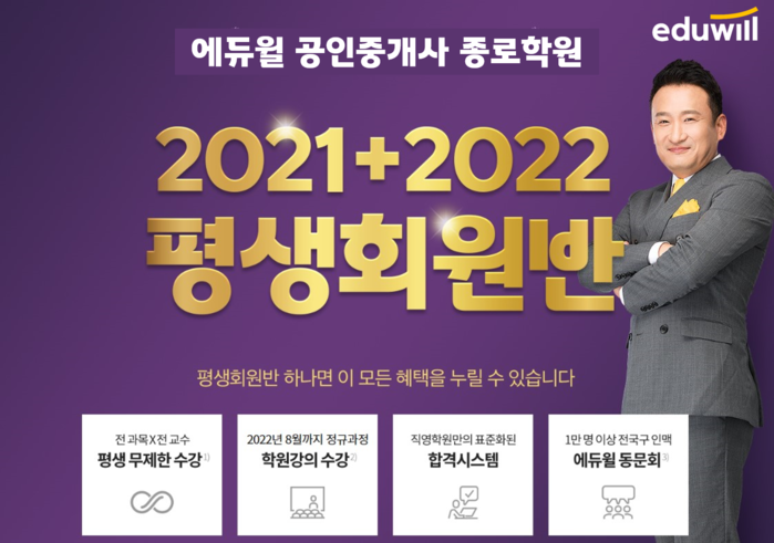 [시민일보 = 여영준 기자] 종합교육기업 에듀윌(대표 박명규) 공인중개사 종로학원이 2021년 제32회는 물론 2022년 제33회 공인중개사 시험까지 대비할 수 있는 ‘1+1 평생회원반’을 오픈하고, 신규 수강생을 모집하고 있다.
