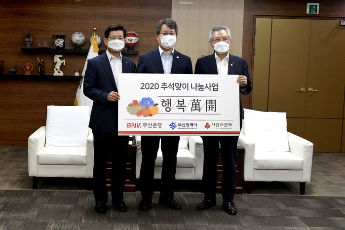 먼저 부산은행은 22일 오전, 부산시청에서 부산지역 소외계층의 차례상 차림 지원을 위해 4억4000만원 상당의 ‘명절 복(福)꾸러미’를 전달하는 ‘2020 추석맞이 행복만개(萬開) 나눔사업’ 행사를 진행했다.