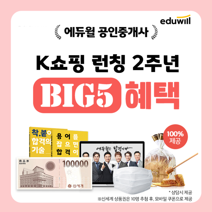 에듀윌 공인중개사는 2주년을 기념한 BIG5 혜택을 마련했다. 공인중개사 수험생들은 K쇼핑 에듀윌 공인중개사 ‘100% 환급 평생패스’ 방송 중에 상담 예약만 남겨도 파리바게뜨 토종효모 꿀토스트 플러스 모바일 기프티콘, 3단 필터 국내산 마스크 5장, 에듀윌 공인중개사 기초강의 7일 무료체험권, 기초용어집&합격필독서를 받을 수 있다.