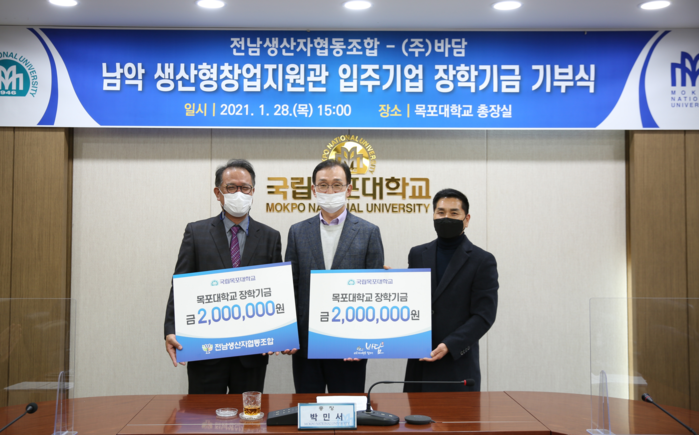 국립목포대학교(총장 박민서)는 지난 28일(목) 오후 3시 총장실에서 남악캠퍼스 생산형창업지원관 내 창업보육센터 입주기업인 전남생산자협동조합과 ㈜바담의 장학기금 기부식을 개최했다고 밝혔다.