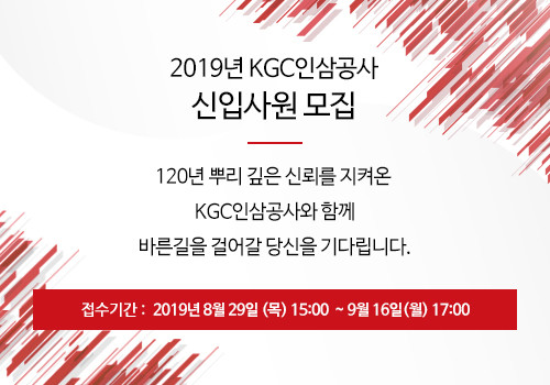 [시민일보 = 고수현 기자] KGC인삼공사(사장 김재수)가 오는 9월16일까지 '2019년 하반기 신입사원'을 모집한다.