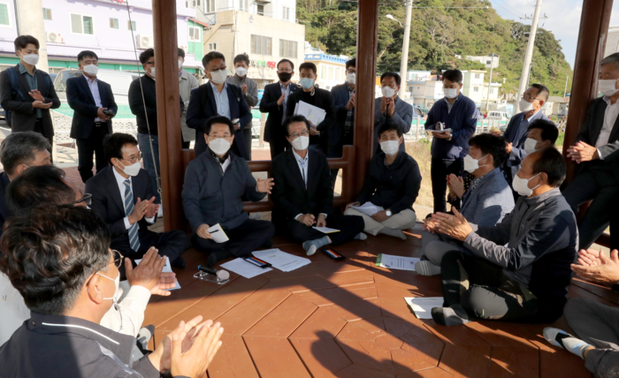 방파제 공사 현장을 찾아 업체 관계자들의 태풍 피해 복구를 독려한 김 지사는 육지에서 가장 먼 곳에서 고생하고 있는 주민들의 불편사항을 직접 듣고 해결을 약속했다.