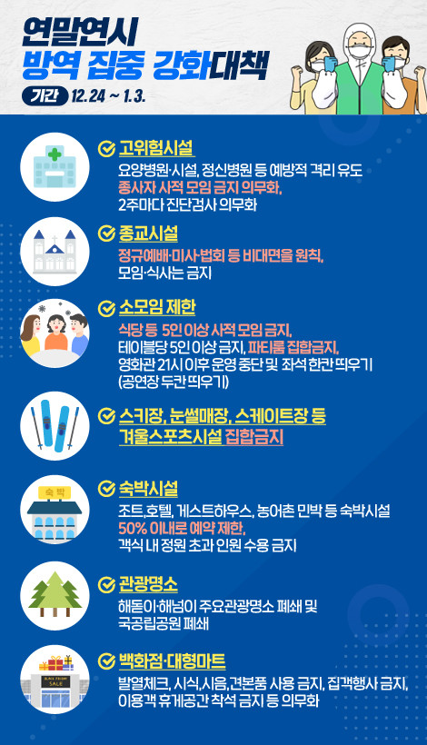 또한, 연말연시에 인파가 몰리는 주요 관광명소 및 국공립공원 등은 전면 폐쇄되며, 대규모 집단감염이 계속되고 있는 요양병원, 요양시설 등 취약시설은 외부인 출입통제, 종사자 사적모임 금지, 2주마다 선제검사를 실시하게 된다.