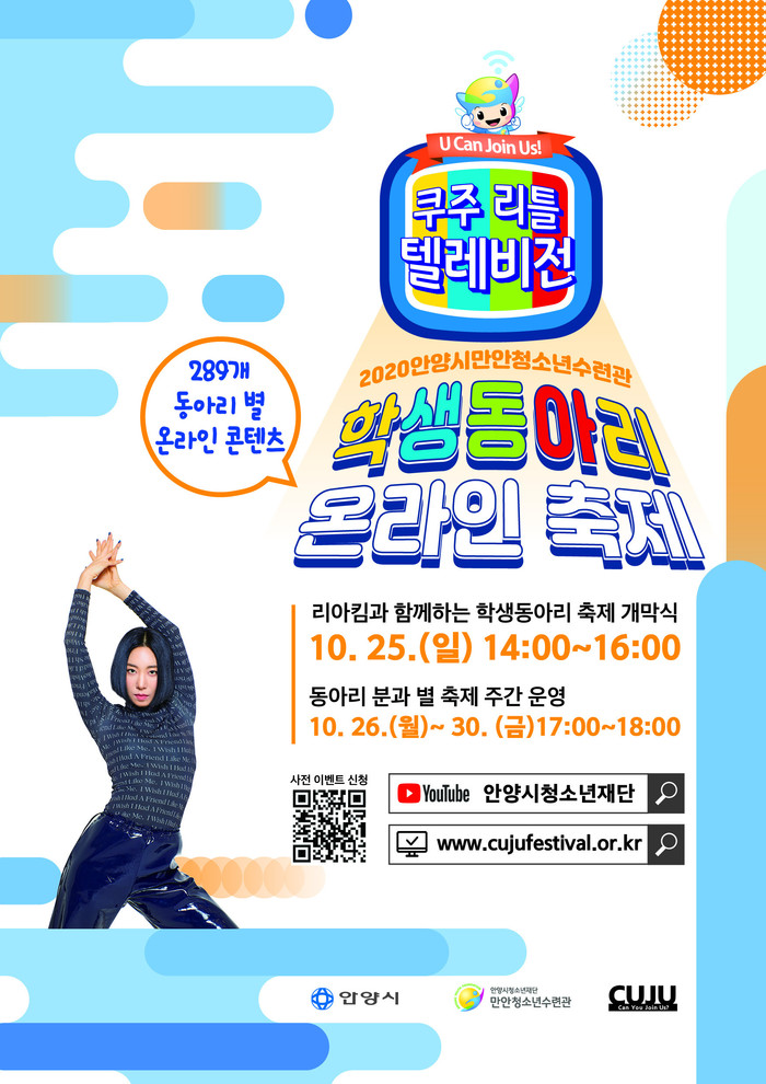 특히 10월 25일 오후 2시부터 시작되는 개막식에는 안양시청소년재단 홍보대사인 세계적인 안무가 리아킴과 학생동아리연합회 임원진 청소년들이 직접 기획한 이벤트를 함께 진행하며 학생동아리 온라인 축제에 흥미로움을 더할 것으로 기대된다.