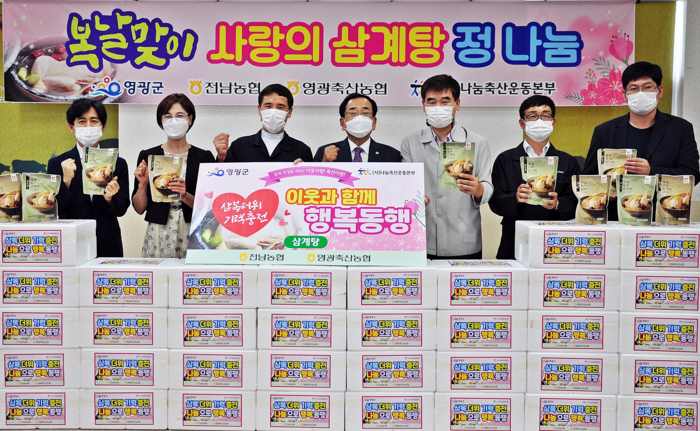 이 날 행사는 무더위의 시작을 알리는 복날을 맞이하여 지역사회 어르신과 이웃에게 희망과 사랑의 정을 나누기 위해 마련됐으며, 농협은 영광군(군수 김준성)과 함께 힘든 시기를 겪고 있는 지역민 300여가구를 대상으로 영양 불균형 해소와 무더운 여름을 잘 극복하자는 마음을 담아 국산 삼계탕(10백만원)을 전달하는 사랑의 정 나눔을 실천했다.