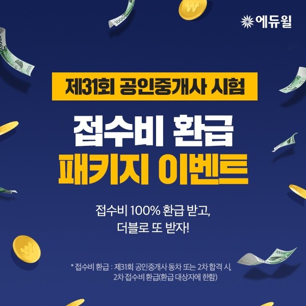 이번 이벤트는 2019년 5월 1일 이후 에듀윌 공인중개사 온라인 강좌를 구매한 회원을 대상으로 제31회 공인중개사 시험에 동차 또는 2차 합격시 2차 접수비를 환급해주는 것이다.