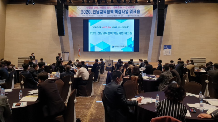 전라남도교육청(교육감 장석웅)이 지난 28일(목) ~ 29일(금) 진도 쏠비치 에서 ‘냉철한 성찰과 따뜻한 협업으로 미래를 여는 전남교육 실현’을 주제로 ‘2020. 전남교육정책 핵심사업 워크숍’을 개최했다.