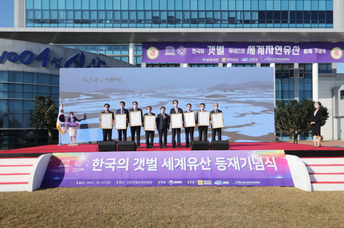 신안군(군수 박우량)은 입추를 지나 선선한 바람이 불어오는 가을에 무채색의 갯벌이 울긋불긋한 화려한 옷을 차려입은 10월 27일, 신안군 청사 내 잔디광장에서 ‘한국의 갯벌’유네스코 세계자연유산 등재 기념식을 개최했다고 밝혔다.