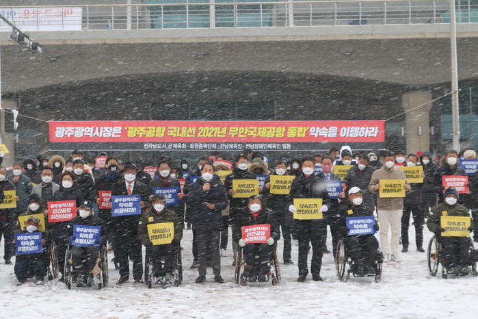 전라남도체육회(회장 김재무)는 14일 오전, 무안국제공항에서 전남체육인, 장애인체육인 100여명이 모인 가운데 2021년까지 광주 민간공항 이전 약속을 변함없이 이행할 것을 강력하게 촉구했다고 밝혔다.