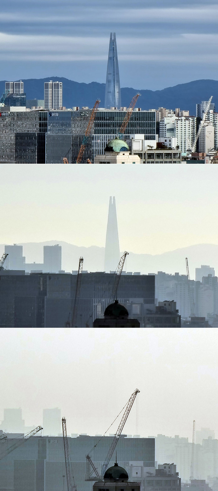 초미세먼지가 나쁨 수준을 보인 4일 오전 서울 종로에서 바라본 롯데월드타워가 미세먼지에 가려 보이지 않는다. 위부터 지난 10월 12일, 10월 28일, 11월 4일 모습. 미세먼지 농도는 내일도 수도권과 충북, 충남에서 '나쁨', 강원 영서와 대전, 세종, 광주, 전북, 대구는 오전에 '나쁨' 수준일 것으로 예상됐다.