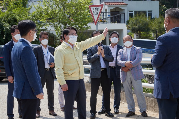 오세현 충남 아산시장이 최근 배방읍 수철1리 마을 안길 정비공사 현장과 수철저수지 수리시설 개보수사업 현장을 방문해 주민들과 소통하는 시간을 가졌다. 이번 방문은 오세현 시장의 ‘현장 사랑방’ 네 번째 방문으로 오 시장은 이날 지난해 수해를 입은 주민들을 격려하며 각종 불편 사항을 청취했다. 사진은 오 시장이 공사 현장을 살펴보며 주민들과 이야기를 나누고 있는 모습.(사진제공=아산시청)