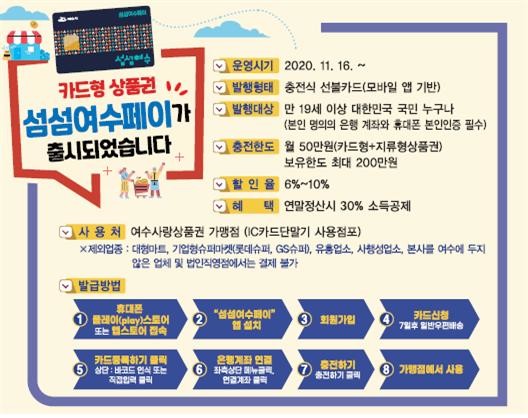특히 지난 2020년 11월 16일에 출시된 섬섬여수페이는 충전식 선불카드형 상품권으로 휴대폰에서 ‘섬섬여수페이’ 앱을 다운받아 신청하면 된다. 신청일로부터 7일 후 일반우편으로 카드가 배송되면 수령 후 앱에서 결제계좌를 연결해 충전하고 지류상품권과 동일하게 사용할 수 있다.