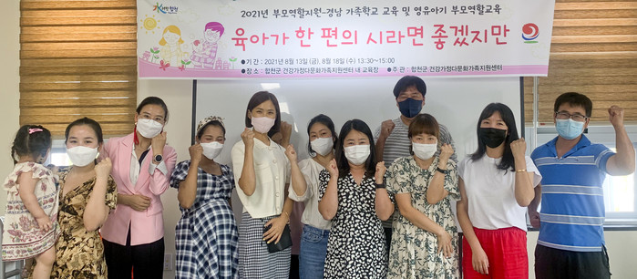 합천군(군수 문준희) 건강가정다문화가족지원센터에서는 8월 13일, 18일 총 2회기에 걸쳐 관내 군민 중 영유아기 부모 10명을 대상으로 영유아기 부모역할교육 「육아가 한 편의 시라면 좋겠지만」 프로그램을 운영한다고 밝혔다.