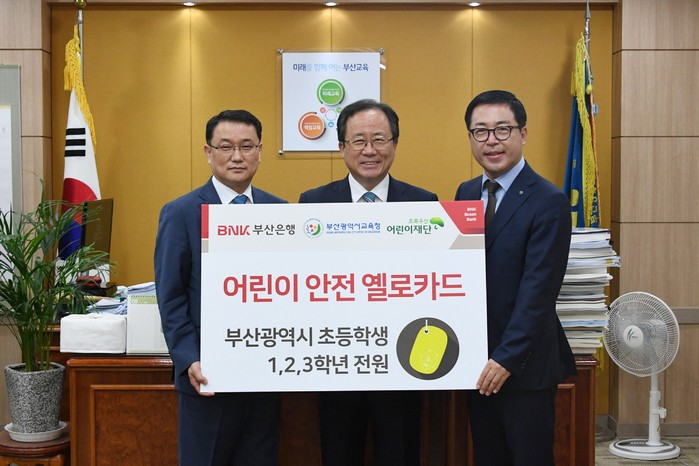 BNK부산은행은 26일 오전 부산시교육청에서 전달식을 갖고 학교 앞 스쿨존 안전사고를 방지할 수 있는 ‘어린이 안전 옐로카드’ 9만개를 전달했다고 밝혔다.