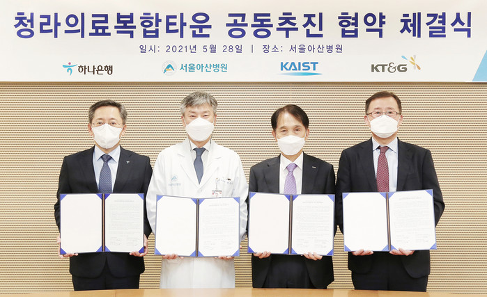 [시민일보 = 여영준 기자] 하나은행은 지난 28일 오후 송파구 풍납동 서울아산병원 동관에서 서울아산병원, 한국과학기술원(이하 KAIST), KT&G 와 '청라의료복합타운'의 성공적인 사업 공동 추진을 위한 업무협약을 체결했다고 밝혔다.