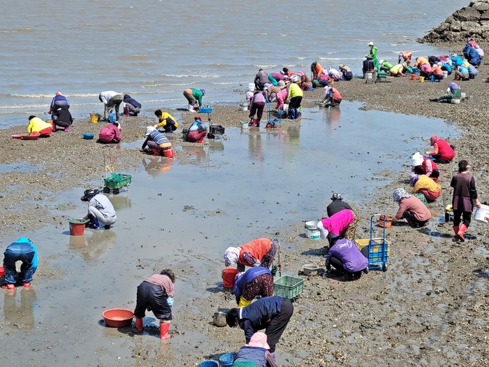 전남 장흥군 안양면 수문마을은 최근 제철을 맞은 바지락 채취에 나섰다. 사진은 수문마을 어촌계원들이 청정 득량만 개펄에서 통통하게 살이 오른 바지락을 캐고 있는 모습.(사진제공=장흥군청)