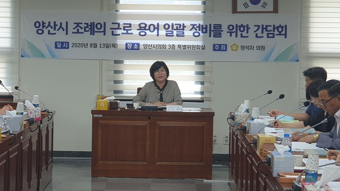 양산시의회 정석자 의원(동면, 양주동)이 지난 13일 오후 시의회 3층 특별위원회실에서 “양산시 조례의 근로 용어 일괄 정비를 위한 간담회”를 개최했다고 양산시의회가 14일 밝혔다.