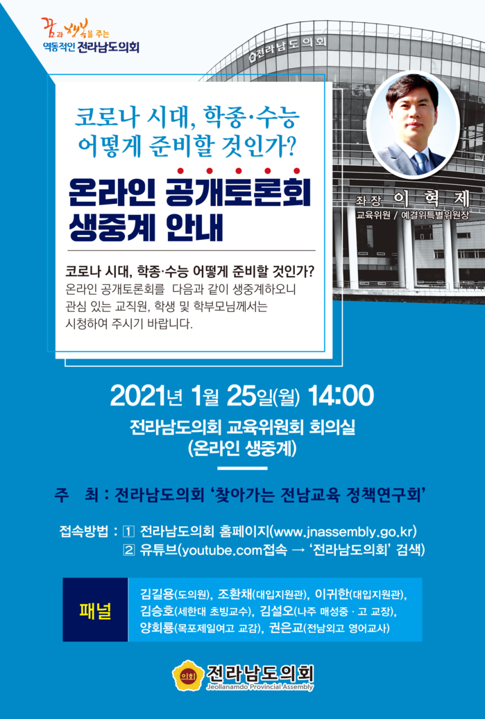 전남도의회 ‘찾아가는 전남교육 정책연구회’(대표의원 이혁제)는 25일 도의회 교육위원회 회의실에서 ‘코로나 시대, 학생부종합전형.수학능력시험 어떻게 대비할 것인가?’라는 주제로 온라인 공개토론회를 개최한다.