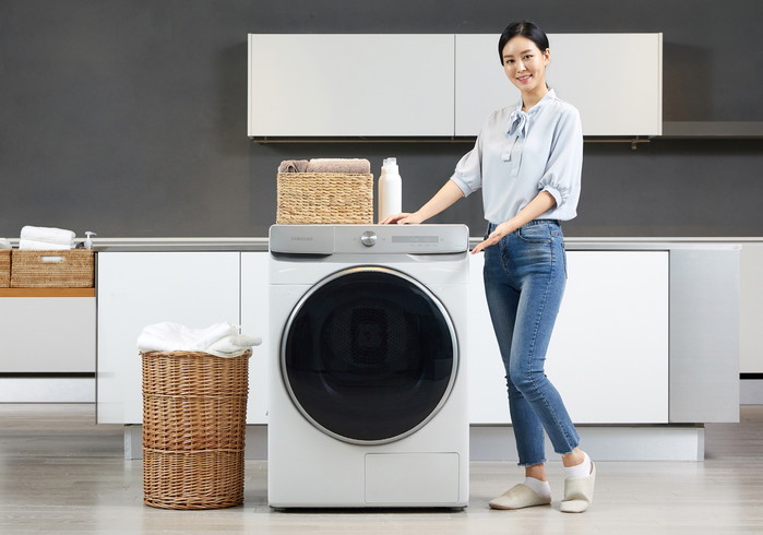 | ▲ 삼성전자 모델이 수원 삼성전자 디지털시티 프리미엄하우스에서 국내 최대 용량인 17kg 그랑데 건조기 AI 신제품을 소개하고 있다.(사진제공=삼성전자) |