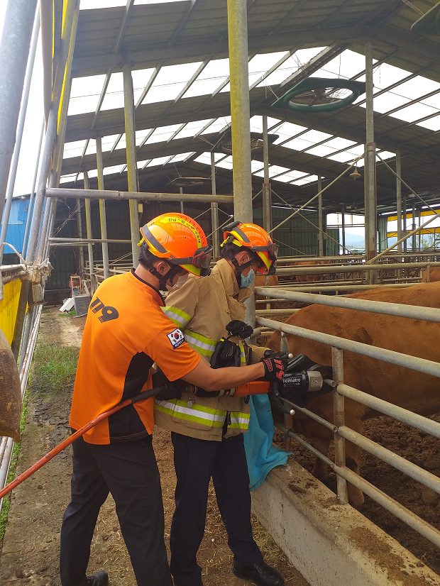 축사 주인의 신고로 출동한 119구조대는 흥분한 소를 진정시키기 위해 모포로 소의 눈을 가린 후 유압절단기로 울타리를 절단하여 소를 안전하게 구조했다.